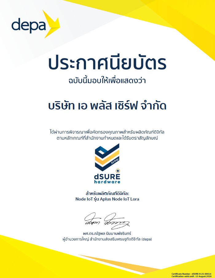 สิ่งที่ทำให้ Aplus Node IoT Lora แตกต่าง คือการได้รับการรับรองมาตรฐานจาก สำนักงานส่งเสริมเศรษฐกิจดิจิทัล (depa) ภายใต้โครงการ dSURE (Digital Service User Reliability & Experience) ในหมวด dSURE hardware ซึ่งยืนยันว่าอุปกรณ์นี้มีคุณภาพ ความปลอดภัย และน่าเชื่อถือ